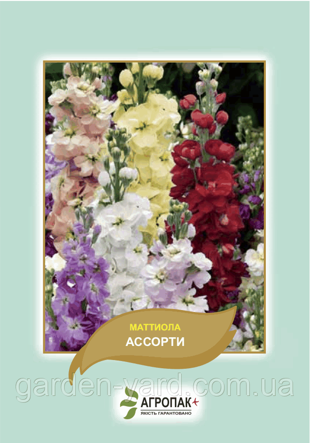 Маттіола сива "Асорті" - однорічна багатобарвна рослина з сильно запашними квітками. Висота 50-80 см. Вважає за краще родючий, добре дренований, не кислий грунт і сонячне місце або півтінь. У рік посадки органічне добриво вносити не можна. Рослину можна вирощувати на зріз або як горщик. Насіння висівають на розсаду з кінця листопада по квітень по 1 насінні в комірку, присипаючи торфом на 2-3мм. Пророщують за температури +180С. Пікірують у горщики 9-11 см через 3-5 тижнів. На постійне місце саду висаджують через 8-10 тижнів. Загартована розсада добре переносить пониження температури до -50С. Щоб забезпечити безперервність цвітіння протягом усього літа, проводять повторні посіви кожні 10-15 днів.